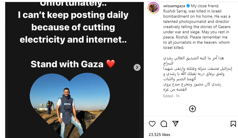 ‘ मेरो नजिकको साथी, रुस्दी सरराज, उनको घरमा इजरायली बम बारीमा मारिए। उहाँ एक प्रतिभाशाली फोटो पत्रकार र निर्देशक हुनुहुन्थ्यो ।’ अन्तर्राष्ट्रिय फोटो पत्रकार विसाम नस्सरले इन्स्टाग्राममा भनेका छन् ।