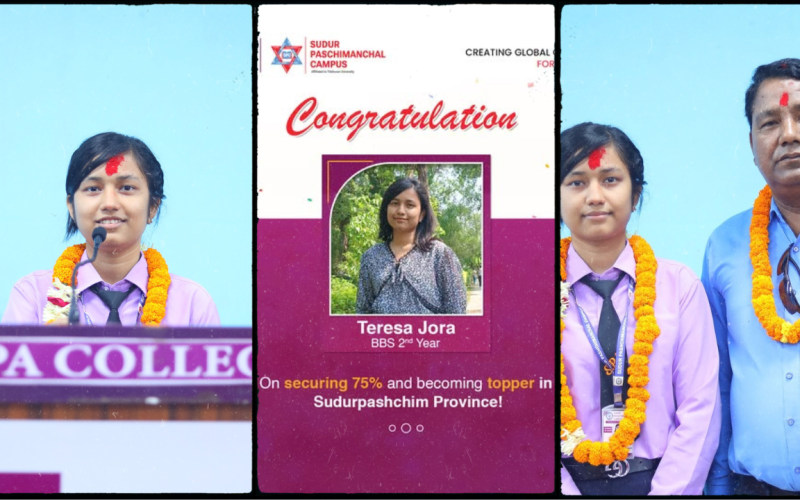त्रिभुवन विश्वविद्यालयले हालै सार्वजनिक गरेको बिबिएस संकाय दोस्रो वर्षको नतिजामा एसपिए कलेज , धनगढीमा अध्ययनरत छात्रा टेरेसा जोराले सुदूरपश्चिम प्रदेश टप गरेकी छिन् । उनले प्रदेशभरमै सर्वाधिक ७५% अंक प्राप्त गरेकी हुन् ।